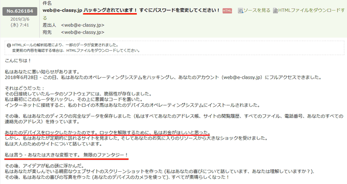 迷惑メール ハッキングされています すぐにパスワードを変更して